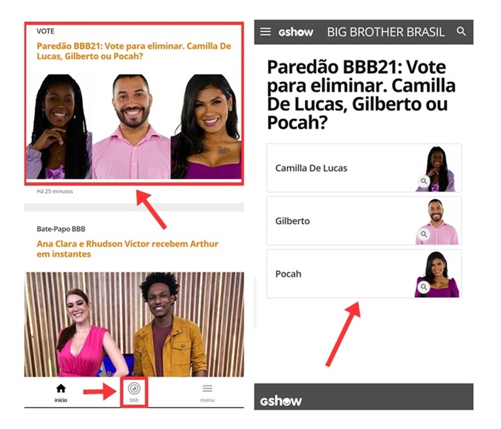 Você pode escolhe a opção mais acessível para dar a sua opinião e o seu voto o importante é participar e votar no BBB 2021 pois o seu voto pode decidir o vencedor do BBB 2021 a maioria das pessoas acabam optando em votar pela a internet pois é gratuita e não tem custo algum além disso na internet é possível que você vote mais. Camilla De Lucas Gilberto ou Juliette. Sendo assim abaixo estão todas as informações de como votar no bbb 2022 que você precisa saber hoje mesmo. Vote no Gshow veja as provas os paredões festas e quem saiu da casa. GShow BBB 2021 Vote Para Eliminar Image. De acordo com a programação oficial da Globo e do Globoplay nesta segunda-feira 22 o BBB 21 Big Brother Brasil começa a partir das 22h30.