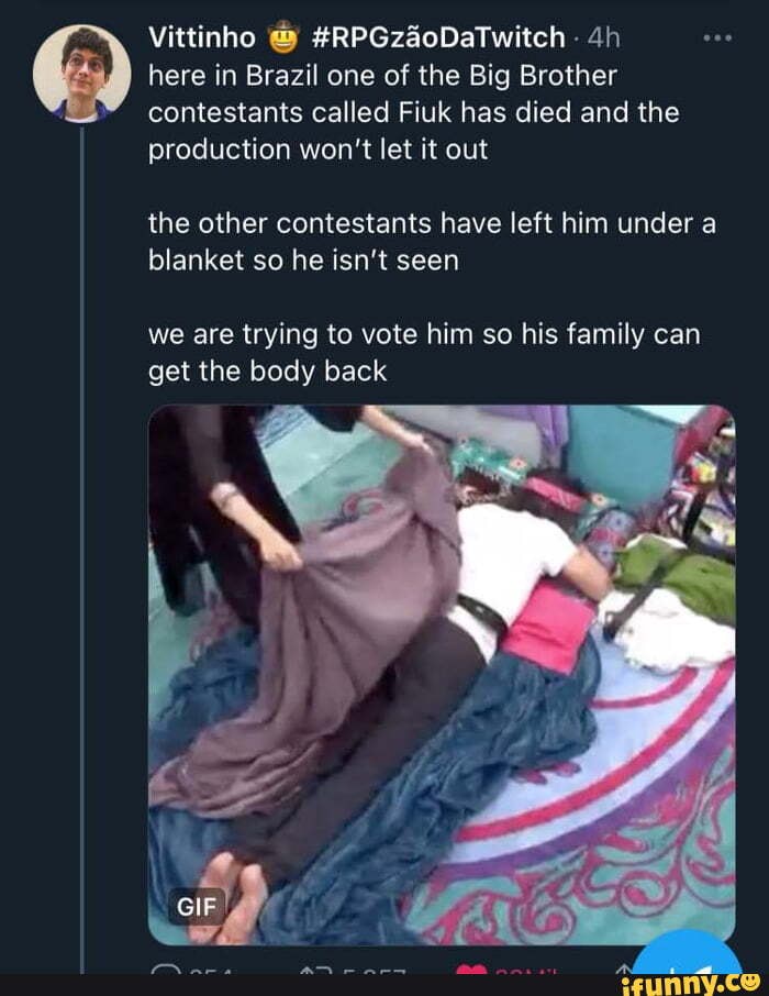 Vittinho Rpgzaodatwitch Here In Brazil One Of The Big Brother Contestants Called Fiuk Has Died And The Production Won T Let It Out The Other Contestants Have Left Him Under A Blanket So