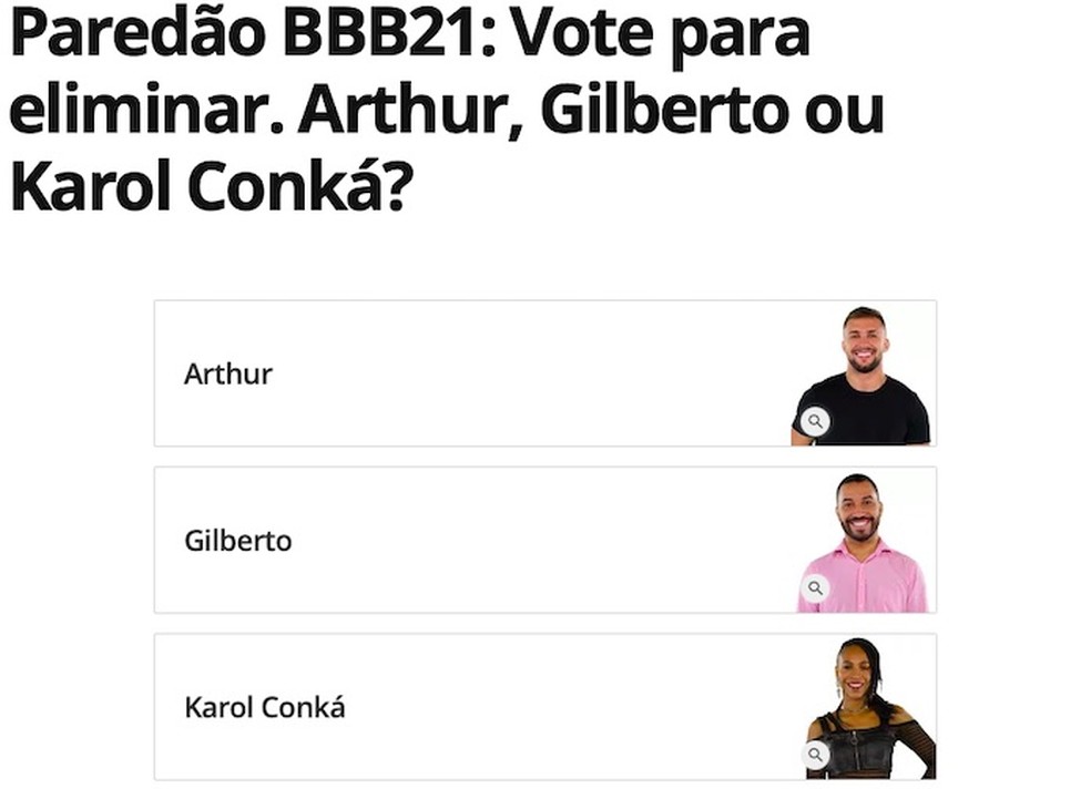Reprodução Globo Compartilhe por. Vote no Gshow veja as provas os paredões festas e quem saiu da casa. Quebrando o juramento que havia feito à rapper de não votar nela se a cantora não a vetasse na prova do líder. Big Brother Brasil 21 was the twenty-first season of Big Brother Brasil which premiered on Rede Globo on January 25 2021. Atualize a página do Gshow se você estiver votando por um navegador. Central de Ajuda Canais Globo Big Brother Brasil 25012021 17h11 - Atualizado em 25012021 17h11 Como faço para votar no BBB21.